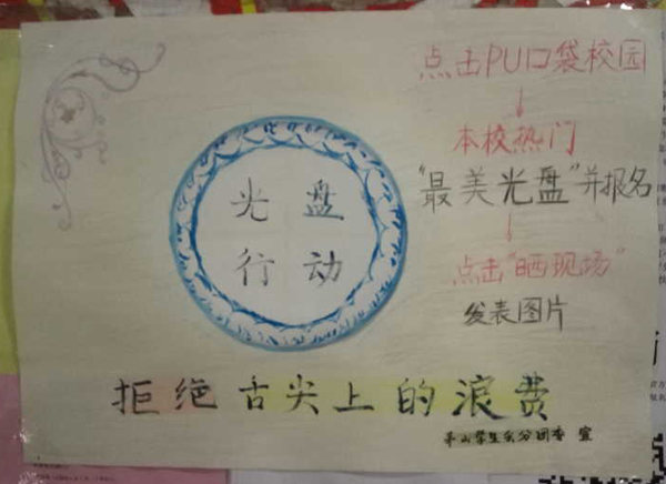 活动中,校区分团委的学生干部们在宿舍区广泛普及了此次行动的相关知识及必要性,也让大家了解到参与活动的流程。同学们则积极参加,纷纷在PU平台上传了最美的光盘。此次“光盘行动”旨在提倡同学们不浪费粮食,记下自己的所有“光盘”时刻的同时,弘扬传播勤俭节约的传统美德。