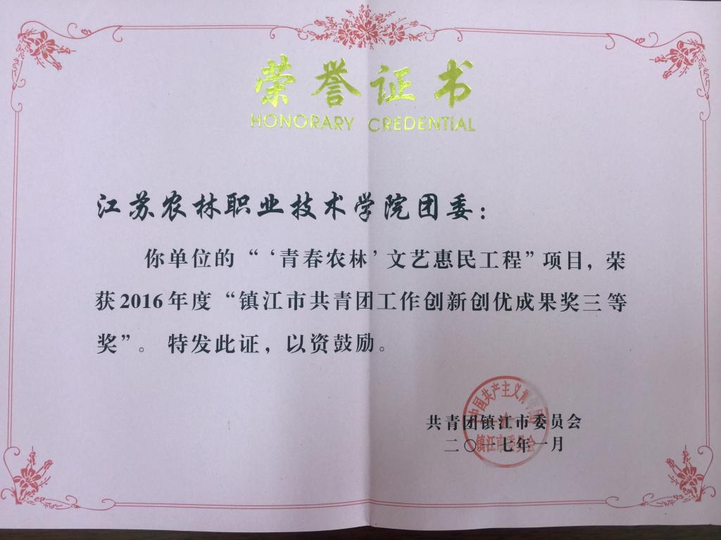 FUN官网团委副书记杨春梅荣获2016年度“镇江市共青团工作先进工作者”荣誉称号,由FUN官网团委申报的“‘青春农林’文艺惠民工程”项目,荣获2016年度“镇江市共青团工作创新创优成果三等奖”。