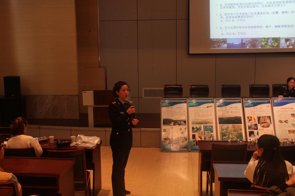 活动中,镇江出入境检验检疫局精心准备了国门生物安全宣传展板和检验检疫人员截获的违禁物品标本,并向参加讲座的师生发放国门生物安全知识宣传手册,受到了同学们的热烈欢迎。专题讲座中,工作人员制作图文并茂的PPT课件,通过大量的图片、数据和典型事例深入浅出地讲解了“外来生物入侵、传播的途径、造成的危害以及我们怎么办”等4个方面的内容。同学们听得认真,看得仔细,不断提问,积极了解检验检疫知识。