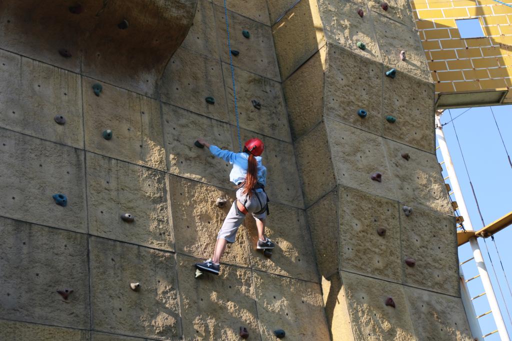 本次活动采取“理论+游戏+分享”的形式,分别进行了“围圈坐腿”、“瞎子贪吃蛇”、“信任背摔”、“坐地起身”、“耐力攀岩”等破冰、协作、竞争为主题的户外拓展活动。活动中,同学们在老师的指导下完成了一个又一个的挑战动作,在轻松欢快的氛围中很快找到了团队归属感,感受到集体的力量和凝聚力。