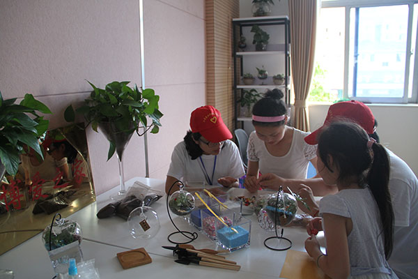志愿者带领孩子们在校园内认识各种各样的绿植,之后来到创客空间园艺微景观孕育室。志愿者给孩子们拿来了精美的微景观成品,观察之后孩子们拿起工具,在志愿者帮助下进行微景观植物的制作。孩子们认真观察,积极动手,添一铲子彩石,栽一棵小树,在摆上可爱的摆件,棒棒的作品完成了。