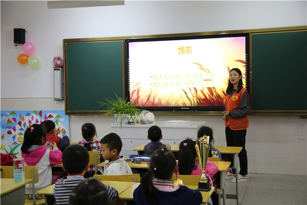 10月16日将是第37个世界粮食日,今年的爱粮节粮宣传周的主题是:“爱粮节粮保安全,优粮优价促增收”。10月12日下午,经济与人文学院的“小菁人”志愿者们来到崇明小学文昌校区一年级五班开展“节约一粒粮食,我们在行动”主题活动。