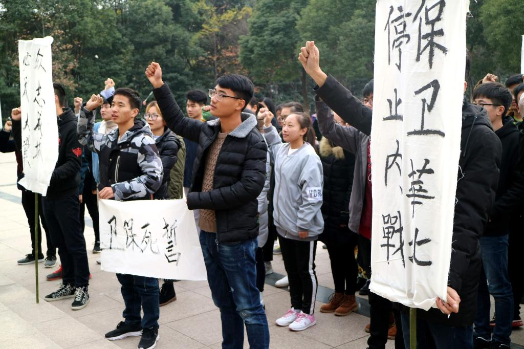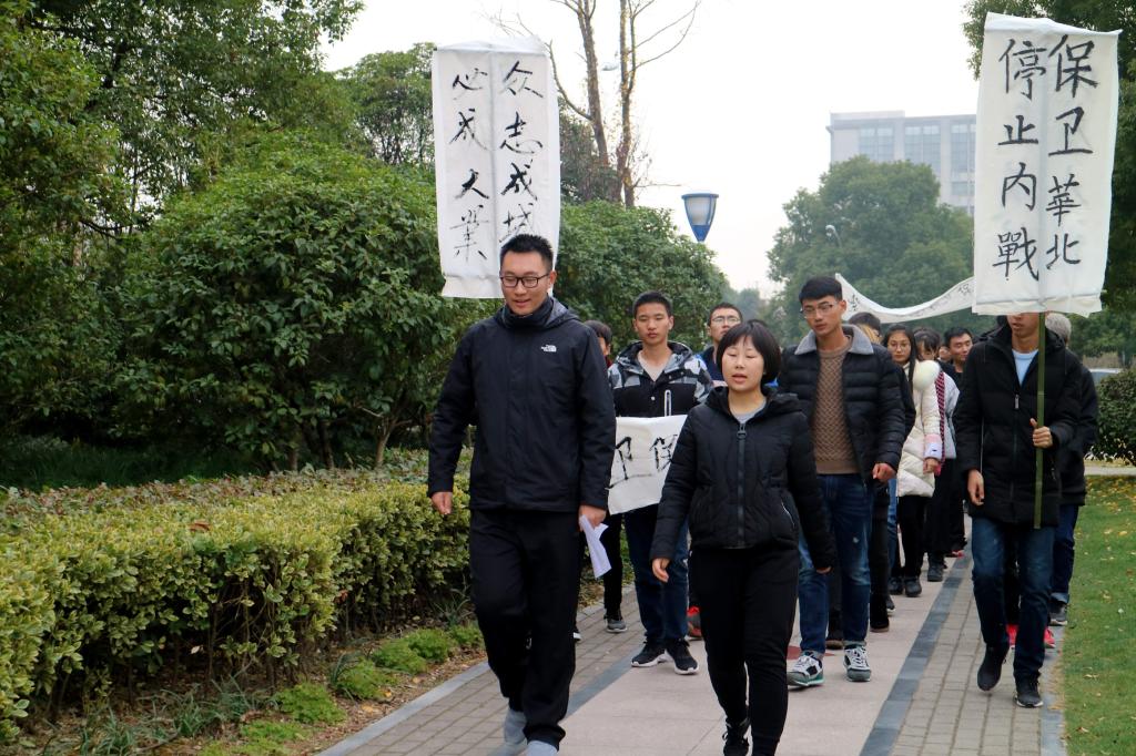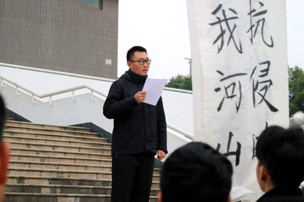 活动以重现“一二·九”运动情景为主线,学生代表带领师生们集合在北校区香樟树前,回顾了1935年12月9日北京数千大中学生“反对华北自治,反抗日本帝国主义,要求保全中国领土的完整”这一爱国壮举,同学们现场制作了“誓死保卫祖国”等标语,师生带着敬畏与热忱举着标语牌重演了前辈们的示威游行来到体育馆门前,学生代表用“别让我们的心太过于麻木”、“星星之火,必可燎原”的现场演讲,激励现场所有青年团员奋斗不息、爱国不止。最后,现场师生高举拳头庄严宣誓:为中华之强大而努力奋斗!