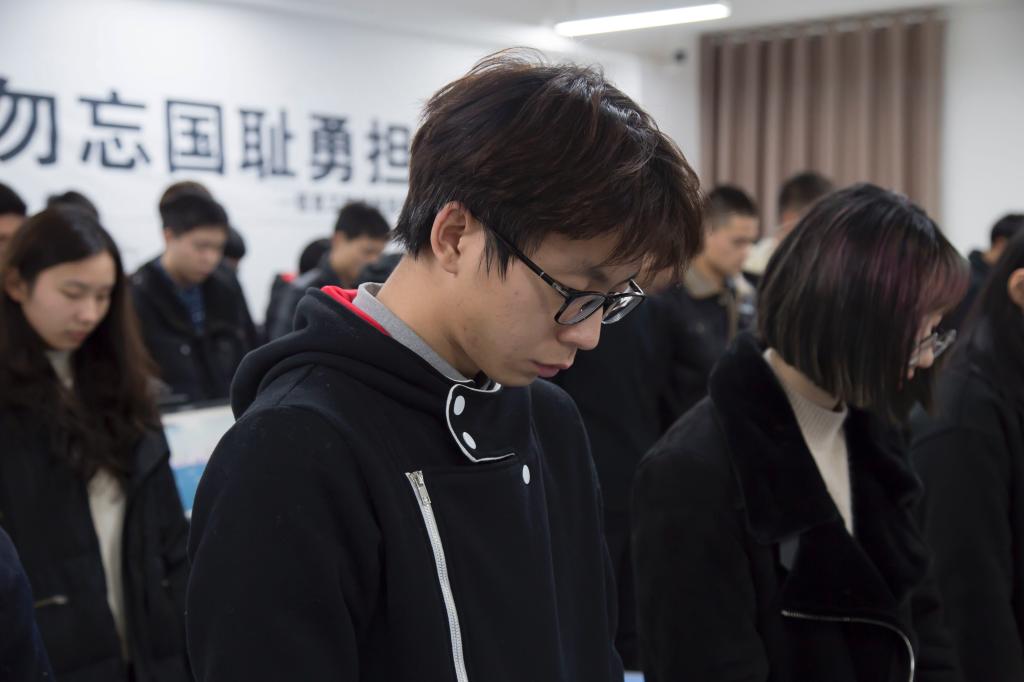 同学们怀着沉痛的心情,仪容庄肃的站立,为80年前遇难同胞和以身报国的英烈们默哀。默哀礼毕,在主持人的引领下,同学们在国家公祭网进行网上祭奠,“点上一只白烛悼亡灵、敬上一束鲜花仰先烈、撞响一口铜钟警世人、许下一段心愿赞和平”,公祭活动的最后,全体同学满怀豪情庄严宣誓:珍爱和平,为中华民族的伟大复兴而奋斗!