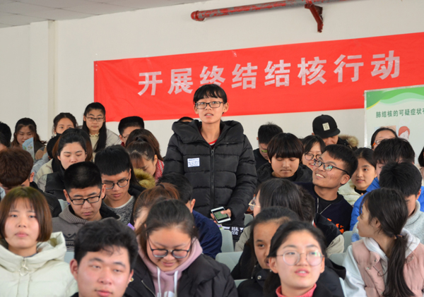 讲座中,丁瑶医师根据大学生日常生活习惯特点,向在场同学详细介绍了什么是结核病、结核病危害、传染源、传播途径、易感人群等相关知识。随后,她还与现场师生互动,现场答疑,同时就大学校园如何防控结核病问题,以及如何对待患病同学做了详细解说。最后,她向现场的师生倡议:注意个人卫生,加强体育锻炼,让肺结核远离校园,让健康伴随你我他。