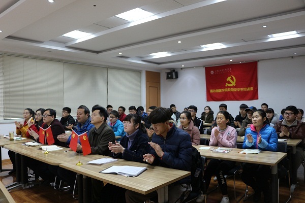 直播期间,会议室内师生聚精会神地观看聆听习近平总书记的讲话,认真做着笔记,听到报告精彩之处自发为之鼓掌,气氛庄严而又热烈。