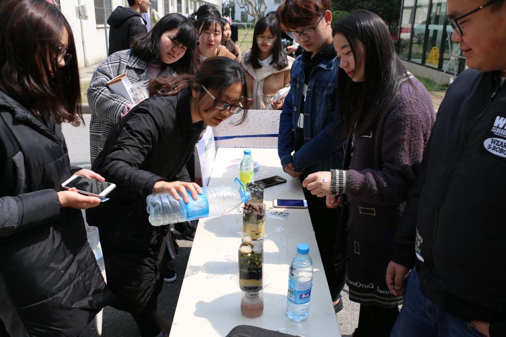 活动中,同学们通过参与节水护水知识竞答、节水治污妙计收集、节水英雄榜张贴等环节认识到节约用水,保护生态环境的重要性。现场还设置了简易净水装置,让同学们体验用石棉、鹅卵石、细沙、活性炭等材料将“污水”变为“清水”的过程,增强同学们生活污水循环再利用的了解。为了吸引过往同学参与,轮滑社、吉他社、五谷杂粮粘贴画等社团也各展所长,现场气氛热烈。