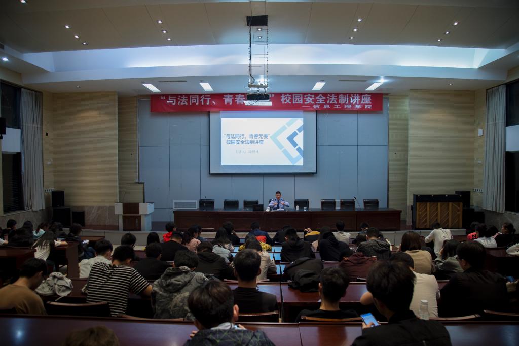 为增强大学生的法制意识,创建和谐校园,引领大学生做知法守法的合格公民,5月8日晚,信息工程学院邀请江苏省边城监狱六监区监区长陈绍林警官在研发楼报告厅开展主题为“与法同行、青春无畏”校园安全法制讲座。信息工程学院各班级班长、宿舍长等130余名学生干部参加了此次讲座。