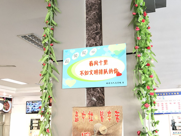 为营造文明的校园氛围, 5月8日下午,经济与人文学院分团委、学生会组织同学们在校园教室、食堂等公共场所张贴文明标语活动。