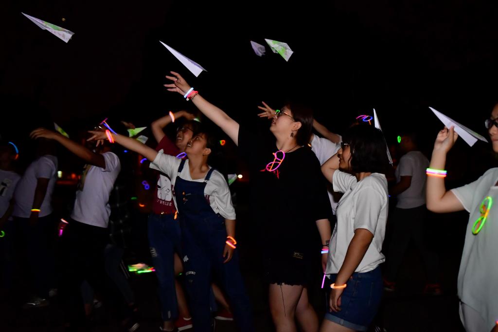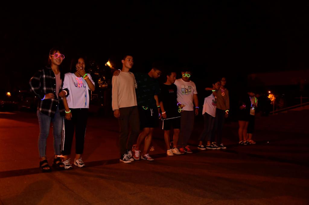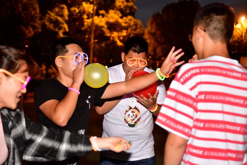 本次趣味荧光夜跑活动设立了5个站点,同学们分成5组,戴着荧光棒、荧光眼镜按照设定路线奔跑,经过各个站点分别完成“背对背拥抱”、“单排小火车”、“两人三足,足下生花、“壮志凌云,放飞烦恼、“终极之战,赢得就是我”五个挑战项目即可通关。同学们在游戏中齐心协力,团结合作,共同完成每一个站点的挑战项目。整场活动气氛热烈,笑声不断。