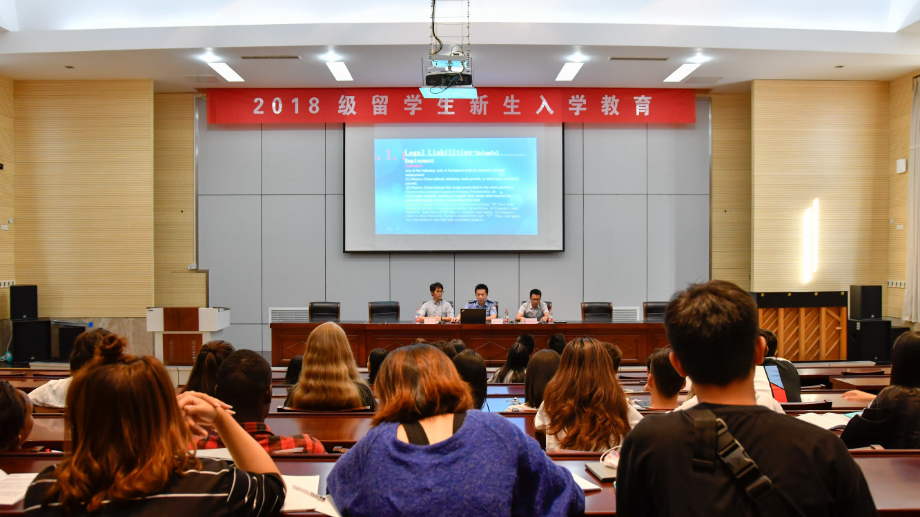 本次入学教育系列活动紧密联系留学生学习与生活实际,旨在帮助留学新生尽快适应和融入在校生活,敦促其更好地专注于学业,顺利完成留学生涯并早日学有所成,入学教育主要包括法律法规普及、校纪校规学习、安全知识技能培训、校园文化体验等内容。国际交流合作中心相关负责人员、句容市出入境管理大队警官、安全保卫处相关同志和全体在校留学生新生参加了入学教育系列活动。