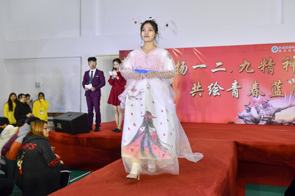 本次大赛以“爱国”“民族”“传统”“梦想”为主题,参赛选手以颜料彩粉手绘、传统扎染技艺或者旧衣物废弃等为原材料设计、制作成衣服,再由模特将作品展现于舞台上。有以京剧人物形象为主题,突出中国风的元素的《满堂花开三千醉》、有表现高洁自强不息精神的《花中君子》,有以黑色棉布为主,以敦煌神女飞天绘色图案为辅,代表着沉稳彰显希望的《子夜吴歌》,独特的设计,自由的造型,在绚丽的作品展示中,各设计师介绍了设计的主题和理念。现场,同学们还以三行诗朗诵、横幅签名的形式表达了自己的爱国热情。