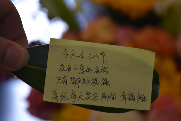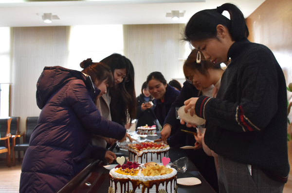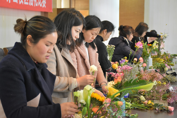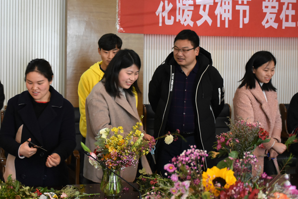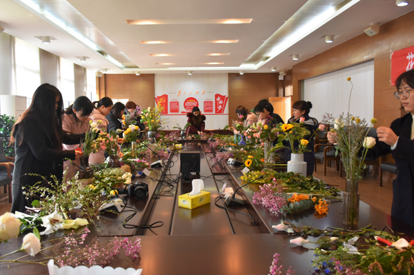 为迎接第109个国际劳动妇女节,3月6日下午,茅山校区分工会在图书馆会议室举办“花暖女神节爱在三月甜”插花活动。 活动现场,分工会16名女教师用自己灵巧的双手,将原本普普通通的玫瑰、百合、康乃馨、满天星等多种花材,修剪、整枝,再根据不同的色彩、形状有层次的搭配在一起。香气怡人的氛围让女教师们兴致盎然。经过大家的努力,一束束融合了女教师们丰富想象力的时尚、美丽插花作品展现在了大家的面前,她们开心的笑容与花朵相互交融。作品完成后,来自各班级的学生代表给女教师们送上了卡片祝福和自制蛋糕。