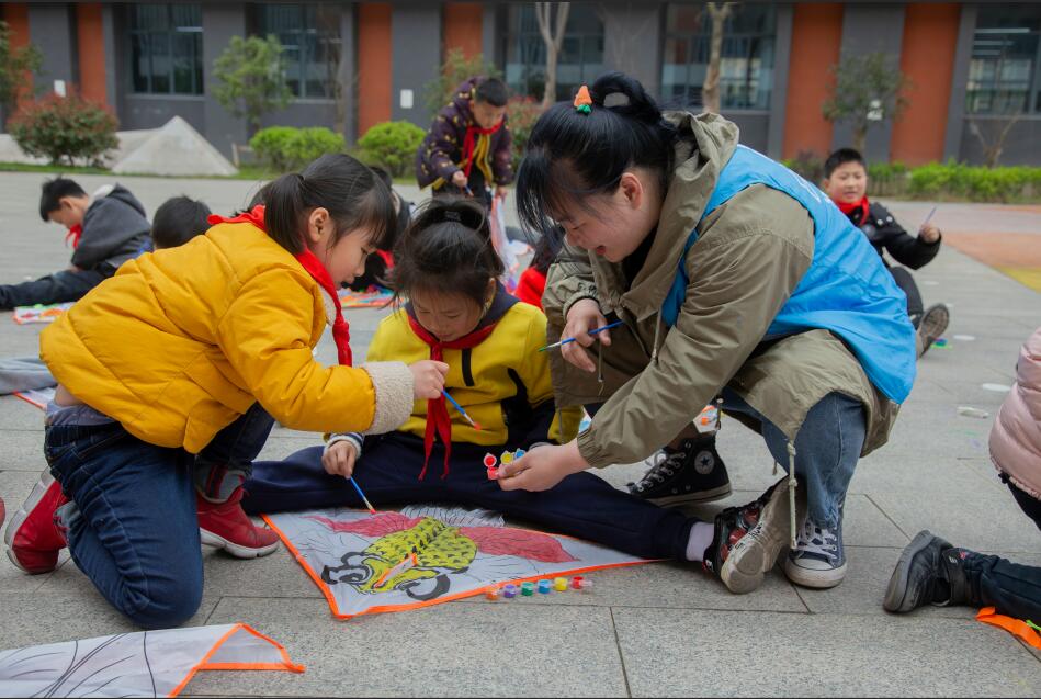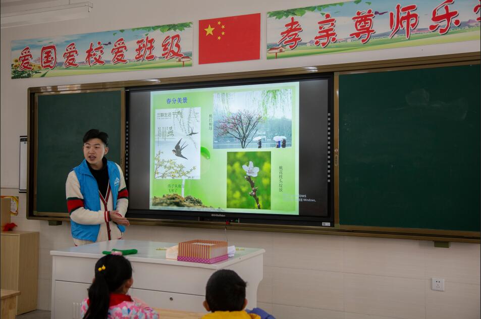 志愿者们结合一年级学生的认知特点和兴趣爱好,制作了图文并茂的PPT,并用幽默生动的语言讲解了春天的六个节气,教会他们初步了解春季中的六个节气知识和相关习俗。最后,志愿者和同学们一起绘制纸鸢,寄托了对春天美好的期许。