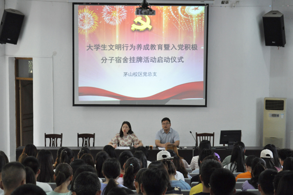 5月22日下午,茅山校区在报告厅开展了“大学生文明行为养成教育暨入党积极分子示范宿舍挂牌启动仪式”活动。茅山校区各班班长、团支书、宣传委员、入党积极分子、各班辅导员参加了此次活动。