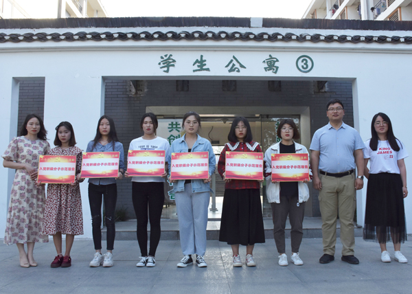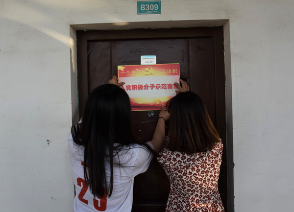 活动第二部分,校区学生党支部书记朱锦带领全体入党积极分子开展“亮身份、做表率、树形象——我是党员我先行”入党积极分子示范宿舍挂牌活动。会议上,入党积极分子代表向全体积极分子宣读了《入党积极分子示范宿舍建设承诺书》,并作出承诺。随后,党员教师带领积极分子到宿舍进行挂牌。此次挂牌活动更好地推进了“大学生文明行为养成教育”活动,通过“亮身份、做表率、树形象”,学生党员、入党积极分子发挥先锋模范带头作用,进一步加强了大学生宿舍文化建设,带领宿舍同学养成良好的文明行为,为和谐校园建设作出积极贡献。