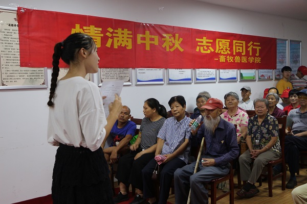 畜牧兽医学院党总支学生党支部联合青年志愿者分会成员于9月11日在建新社区开展“情满中秋 志愿同行”活动。主持人首先以“月亮”为谜语引出本次活动,随后介绍了中秋节的由来以及相关的传说和民间故事,开展了诗词竞猜,现场志愿者与居民竞相回答,现场气氛欢快愉悦;最后志愿者们表演了诗朗诵、爵士舞等节目,社区阿姨们也带来了诙谐幽默的小品,在欢声笑语中,结束了此次中秋活动。