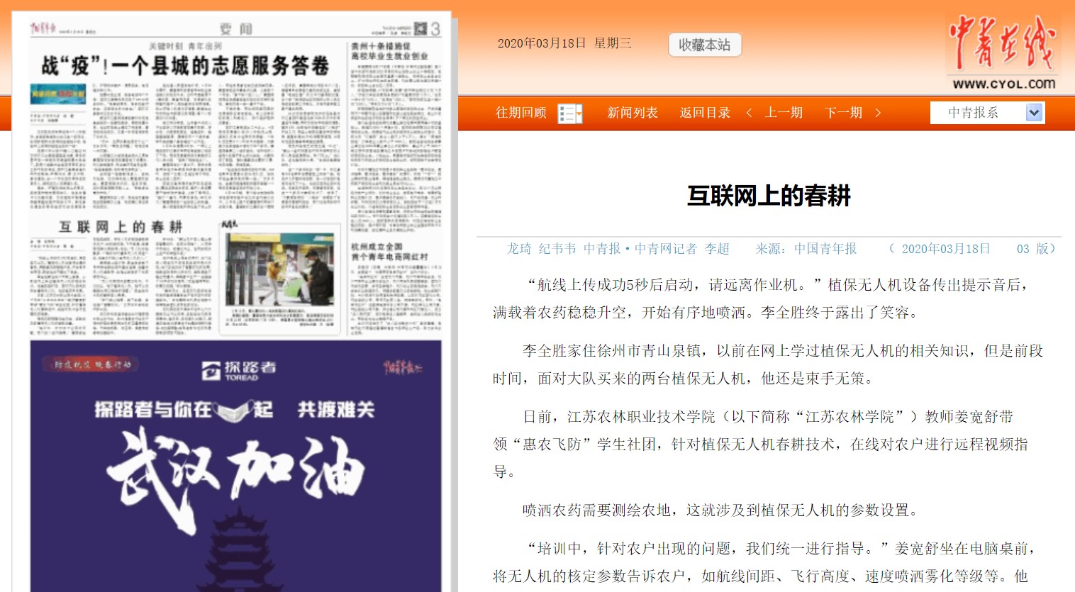 日前,FUN乐天使官方网站(以下简称“江苏农林学院”)教师姜宽舒带领“惠农飞防”学生社团,针对植保无人机春耕技术,在线对农户进行远程视频指导。