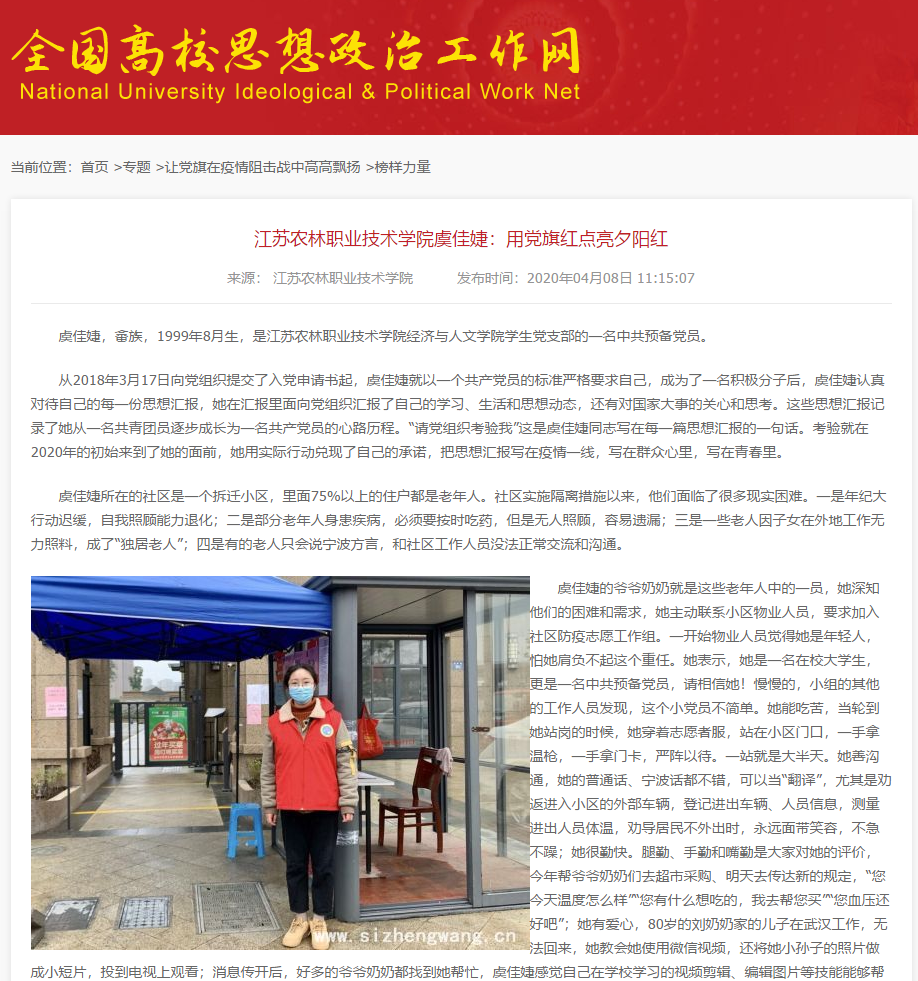虞佳婕,畲族,1999年8月生,是FUN乐天使官方网站经济与人文学院学生党支部的一名中共预备党员。