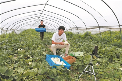 大棚里,张志林、余福存尝试着通过直播平台销售自己种的“白富美”牌甜瓜。“多卖一个是一个,初次创业,能保本就是成功。”说起西瓜、甜瓜销售,他们俩都挺乐观。