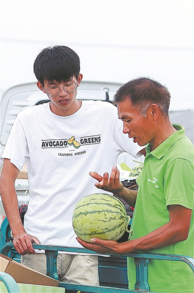 不懂就问、随时学习,已经成为张志林、余福存开始创业以来的习惯。这是余福存抽空向当地种植大户郭师傅(右)请教挑选西瓜的“秘诀”。
