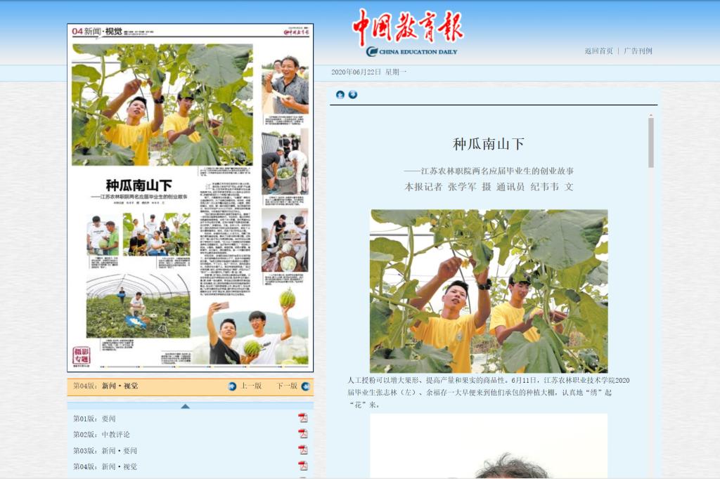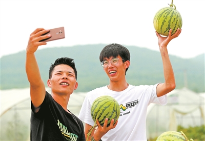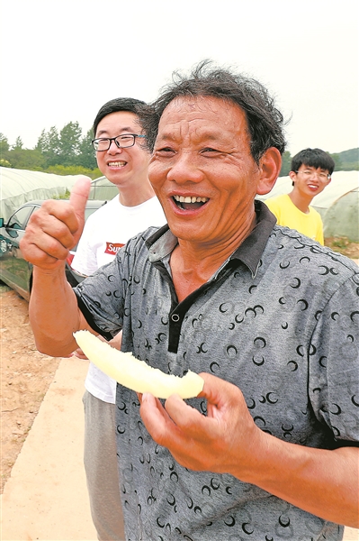江苏省镇江市丹徒区曲阳村“农业+旅游”项目开发者祝顺祥,一边品尝张志林、余福存种的甜瓜,一边竖起大拇指叫好。“没想到,这两个学生娃娃真把事情做成了!”祝顺祥说。