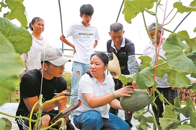 6月12日中午,大棚里的温度高达到40余摄氏度,学校技术指导教师汤伟华(前左二)在帮助张志林、余福存寻找哈密瓜瓜面开裂的原因,并为他们开“药方”。