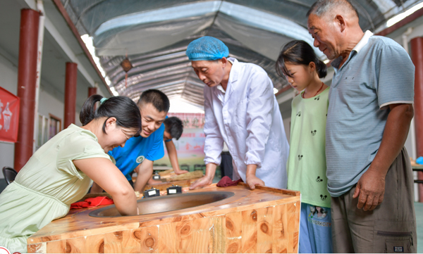 在徐福茶厂,据韦厂长介绍,目前该厂在制茶过程中,手工制茶技术是薄弱项,做出的扁形茶品茶也较差。韦厂长也提前准备了20斤鲜叶,希望实践团队能帮忙解决该茶厂制茶过程中存在的缺陷。这两天,刚好是高温炎热天气,江苏省级手工制茶大师孔凡明携实践团队成员,穿上厚厚的白大褂,在炒茶需要200多摄氏度的制茶锅里,手把手教起了当地茶农制茶。汗水浸湿了他们的白大褂,由于当地手工制茶技术缺乏,因为手工制茶锅长期不使用,生起了铁锈,志愿者们首先一遍遍的清洗了铁锅,又帮助茶农摊放茶叶。一锅、两锅茶,在孔大师和志愿者们的手中慢慢成型,当地茶农也现场学起了手工制茶技术,并不断咨询要领所在。团队成员又来到茶园,帮助茶园挂起了团队赠送的可降解天敌保护型色板,并指导茶农色板的相间距离、高度、更换色板的时长等。实践团队将绿色防控物资送到田间,以保证茶叶质量,增加产量,促进当地茶农生产。