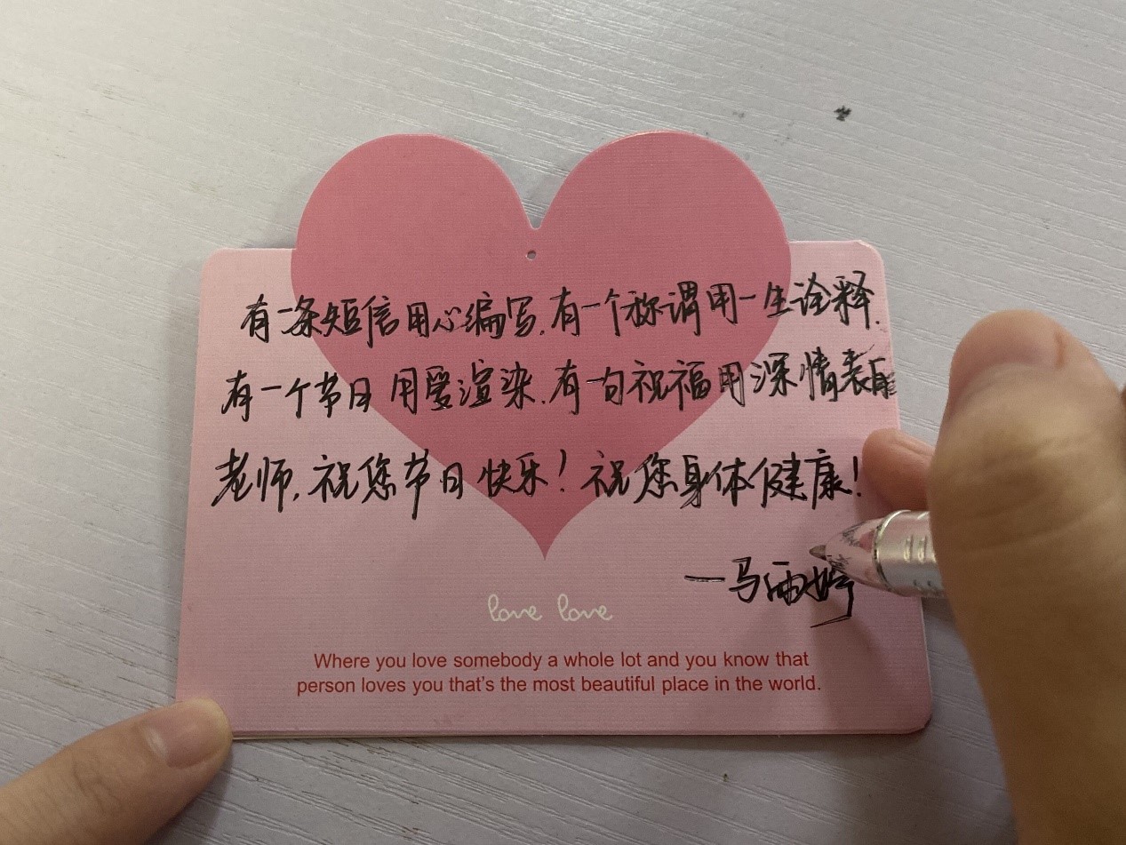 “有一条短信用心编写,有一个称谓用一生诠释,有一个节日用爱渲染,有一句祝福用深情表白。老师,祝您节日快乐!祝您身体健康!”这是FUN乐天使官方网站经济与人文学院学生马雨婷在心意卡留下的祝福。