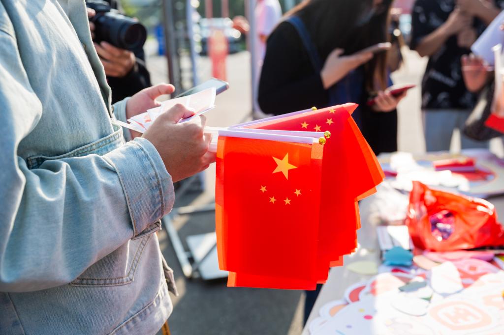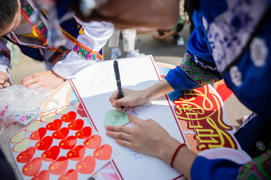 “厉害了,我的国!”“我的祖国,一向强大!”“我骄傲,我的国!” “携手并肩,砥砺前行!”“盛世华诞,与卿同庆!”同学们相互比拼创意,或身着民族服饰载歌载舞,或身穿汉服争先画出有创意的祝福图案,或在便利贴写出饱含家国情怀的真挚祝福语……承载满满祝福的彩色便利贴与阳光交相辉映装点了整个广场。