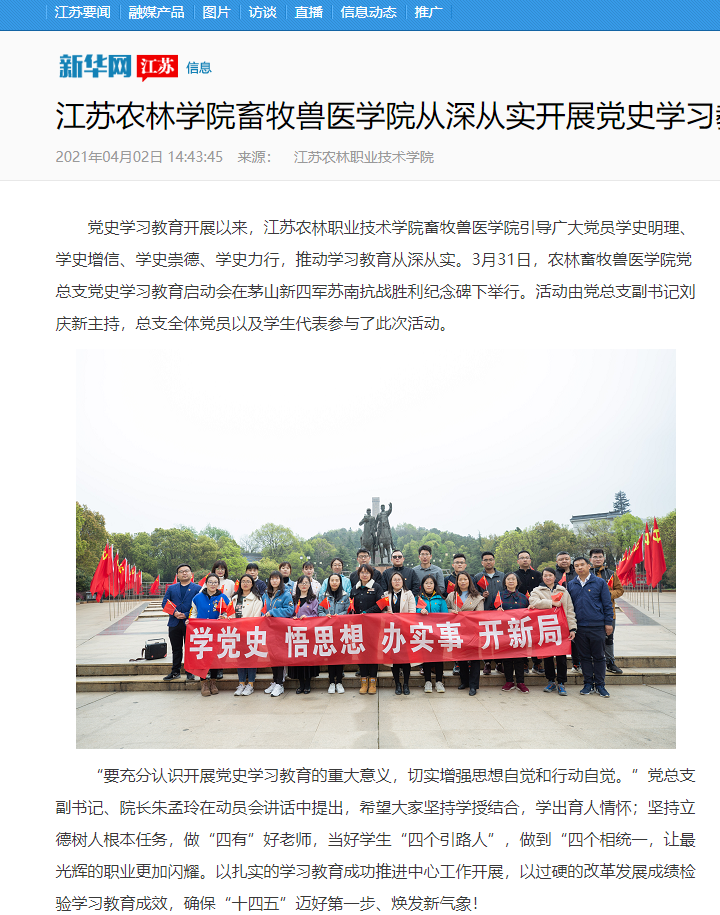 党史学习教育开展以来,畜牧兽医学院党总支引导广大党员学史明理、学史增信、学史崇德、学史力行,推动学习教育从深从实。3月31日,畜牧兽医学院党总支党史学习教育启动会在茅山苏南抗战胜利纪念碑下举行。