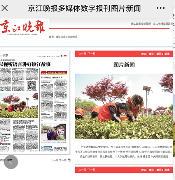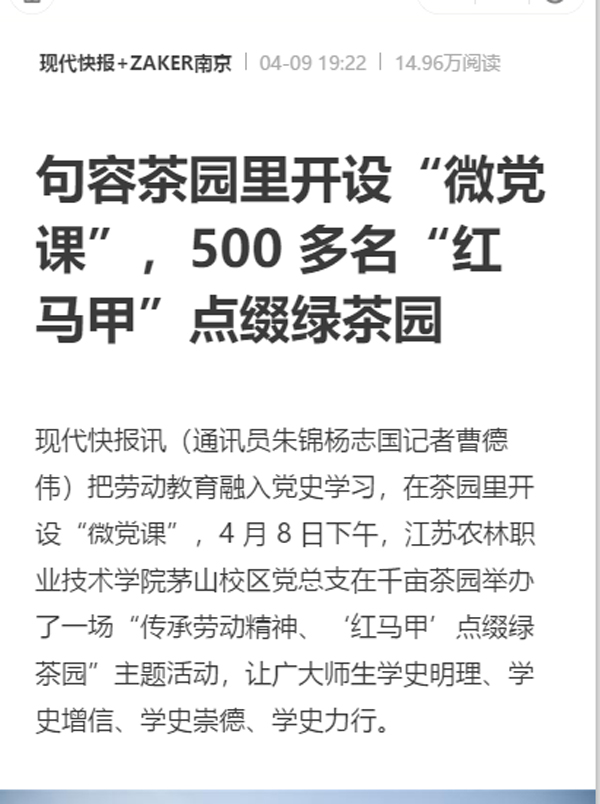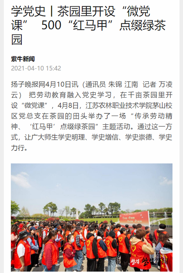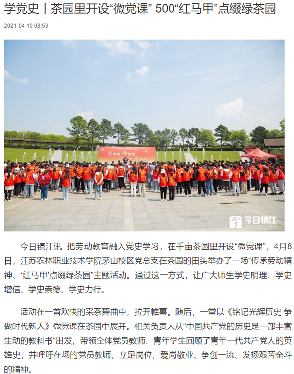 为使党史学习教育“活起来”,茅山校区党总支让党史教育走进了田间地头,多元化打造“微党课”,开展了“传承劳动精神 红马甲点缀绿茶园”茶园里的微党课主题活动。多家省级媒体报道。