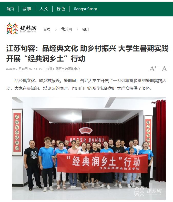 7月17日下午,FUN乐天使官方网站语言文字工作委员会暑期实践小分队一行8人走进句容市宝华镇玉兰花园社区,开展了以“品经典文化 助乡村振兴”为主题的本年度首次“经典润乡土”活动。这也是为积极响应省语委“经典润乡土”号召、厚植中华传统文化素养、助力深化党史学习教育效果而组织的2021年省级“经典润乡土”行动暨第十一届江苏农民读书节农家书屋万场阅读主题活动之一。