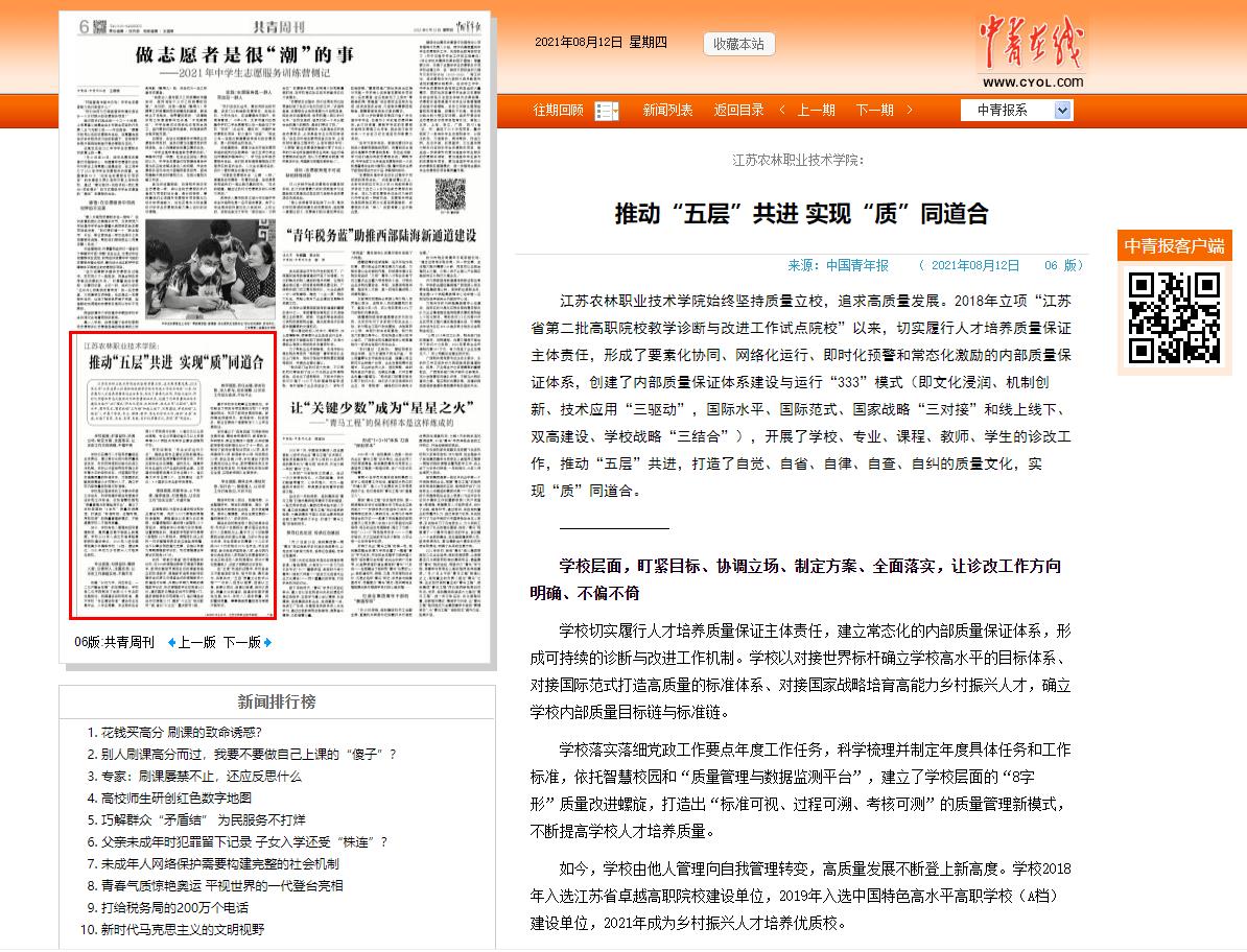 如今,学校由他人管理向自我管理转变,高质量发展不断登上新高度。学校2018年入选江苏省卓越高职院校建设单位,2019年入选中国特色高水平高职学校(A档)建设单位,2021年成为乡村振兴人才培养优质校。