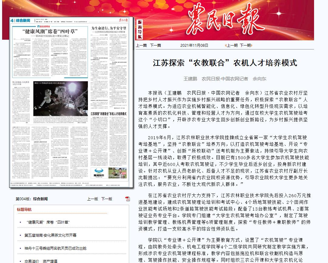 “农教联合”培养高技能人才新模式实施两年多来,把农机驾驶操作融入农业院校的高技能人才教学培养体系,搭建起培养农机化大学生后备人才的平台,打通了大学生回乡创新创业、服务三农的新路径。江苏省农业农村厅将进一步完善“农教联合”模式,面向全省农业院校推广复制“农教联合”的经验做法,为组织实施农机化“两大行动”、推进乡村振兴和农业农村现代化源源不断注入新活力。