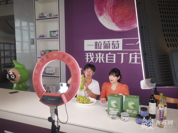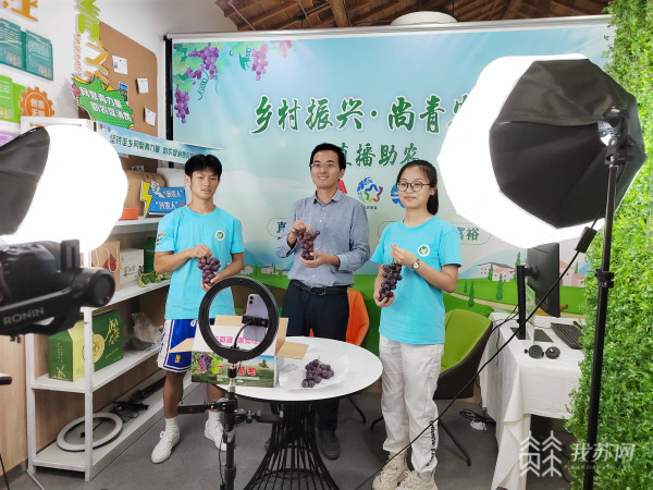不同的是,这天,这个位于句容丁庄万亩葡萄专业合作联社的直播平台比往日更加“热闹”。原来,院长潘永圣、副院长毕德全带着学校多个部门的老师也来“围观”。直播的师生没有任何胆怯,专注而自如地介绍着丁庄葡萄。