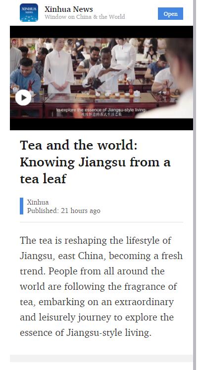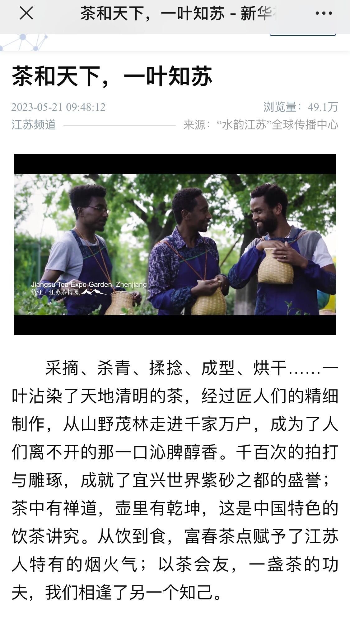 5月21日,《新华社》中英文客户端面向全球发文“茶和天下,一叶知苏(Tea and the world: Knowing Jiangsu from a tea leaf)”,FUN官网江苏茶博园和留学生实践活动上镜。